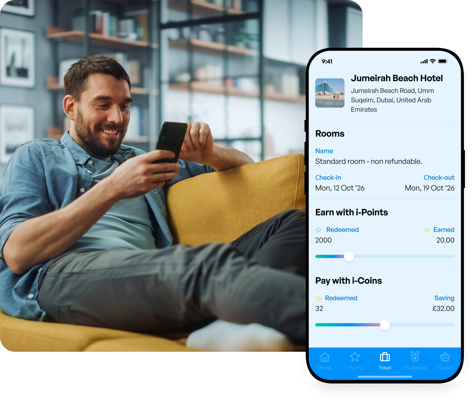 When she books a holiday or hotel stay on the incentifi app - at exclusive wholesale rates - her i-Points turn into coins, which she can use to upgrade her next trip or spend on everyday shopping.